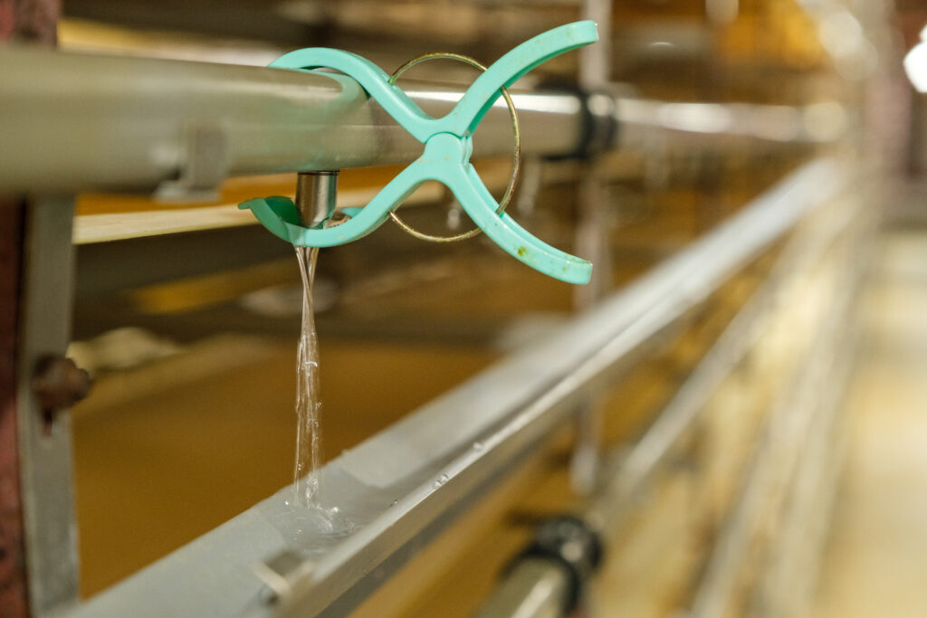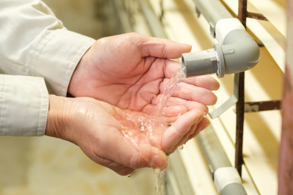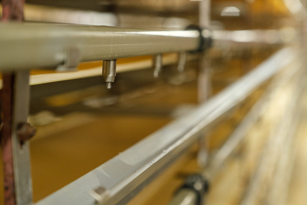 猛暑の夏場は特に水温や水質の管理を徹底し、鶉舎を通過した水すらも、冷たく透明で美味しい水質を維持し、たまごの風味を損なわない工夫をしています。