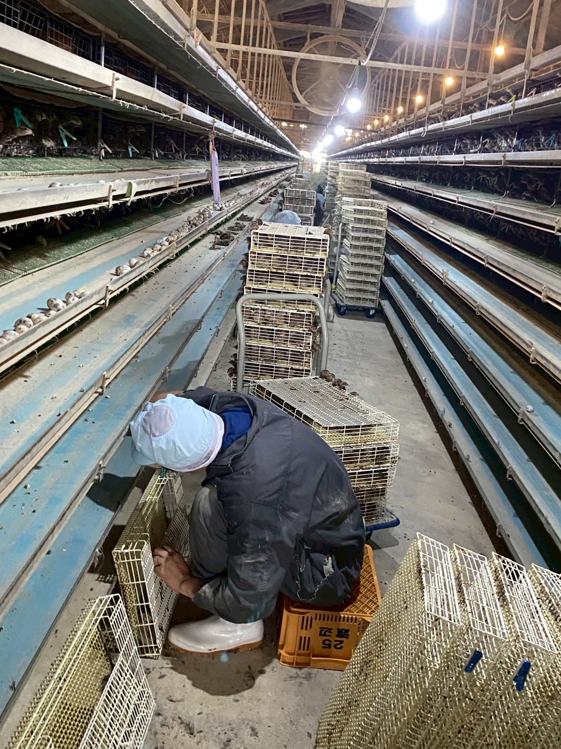 トラックからゲージをおろして鶉舎の中へ運んでいきます。