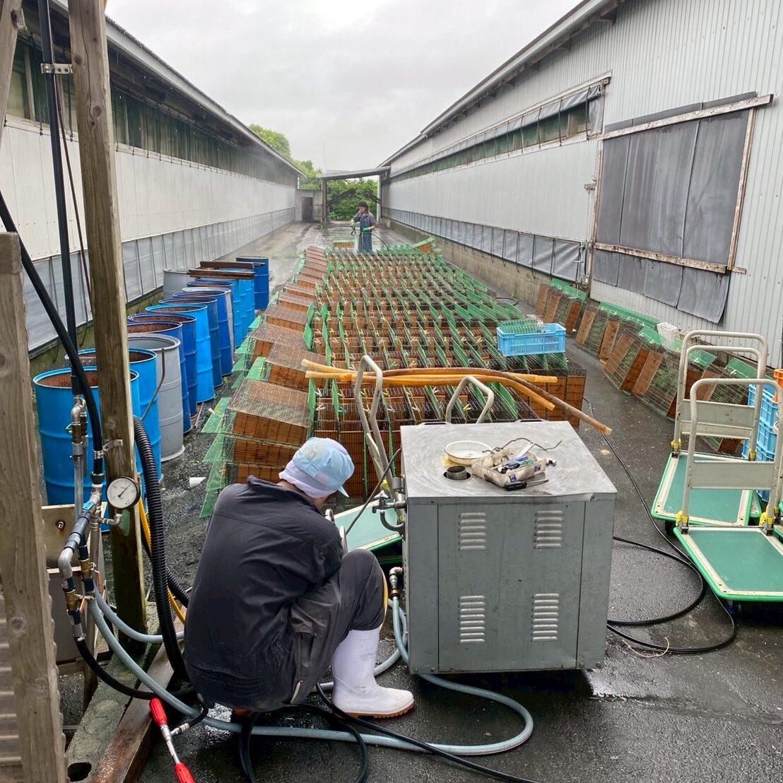 成鶉舎の方では空いたゲージの洗浄が行われていました。
