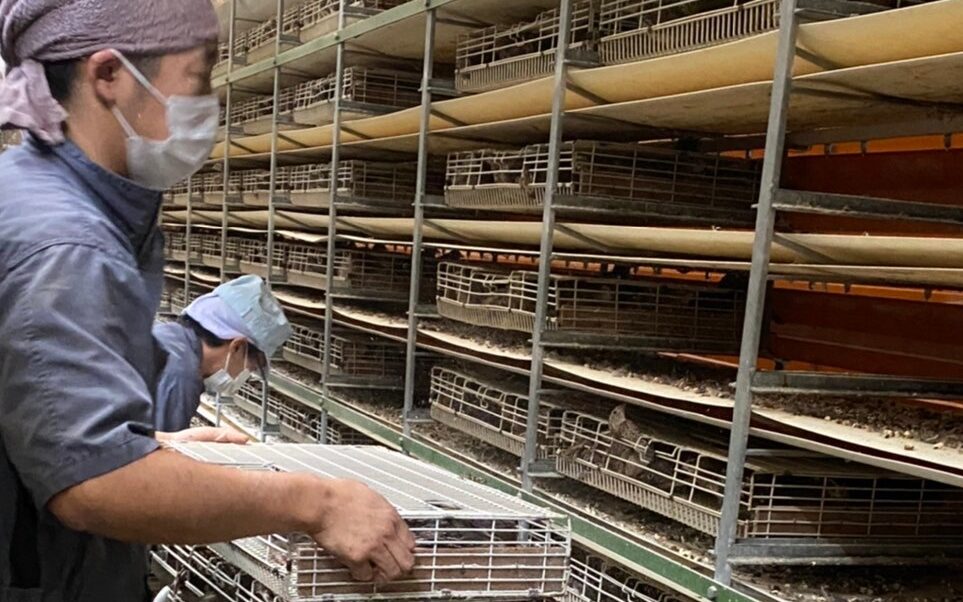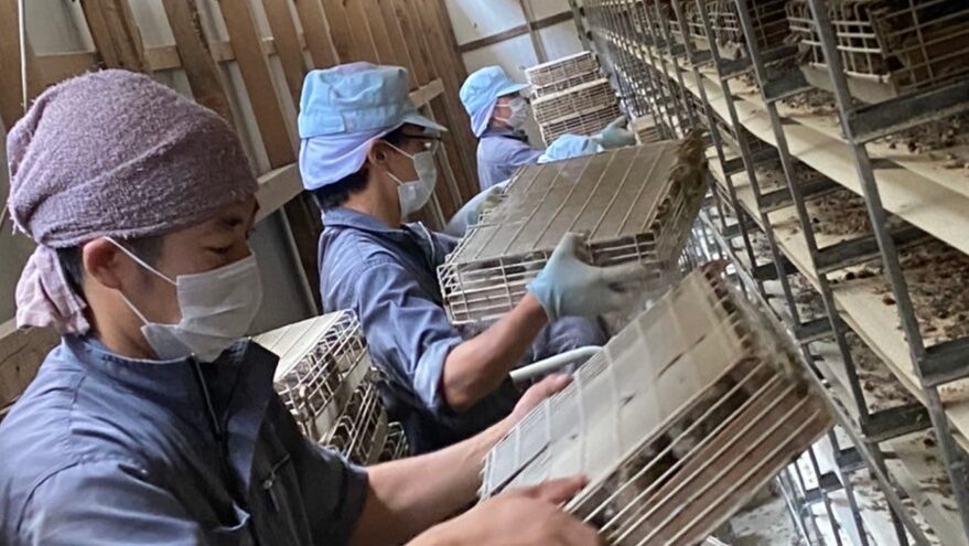 鶉舎につくと、手作業でうずらたちをゲージへと入れていきます。