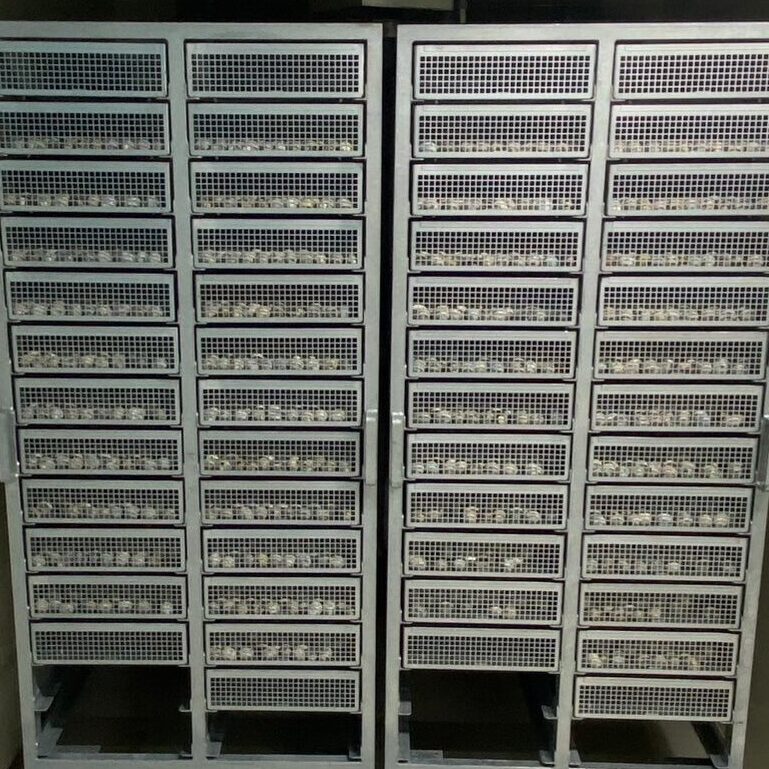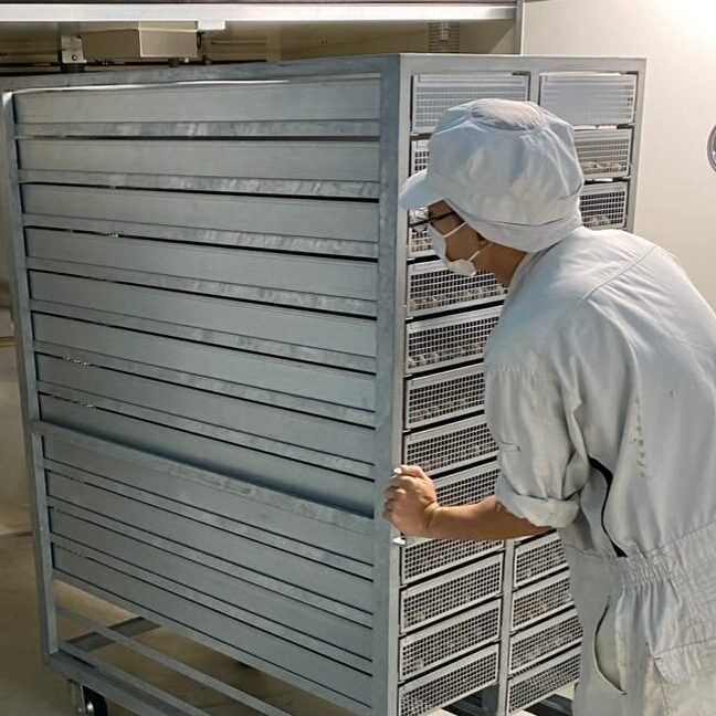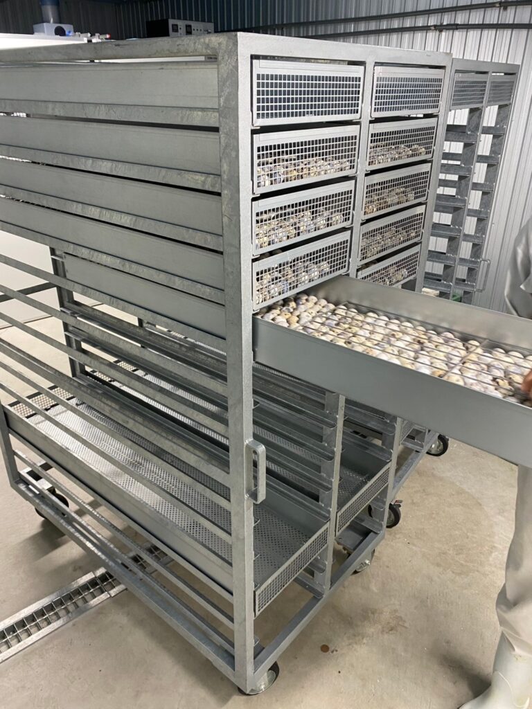 台車に乗せ換え運び孵卵機へと入れ、ここからまた約2週間ここでたまごは温められていきます。