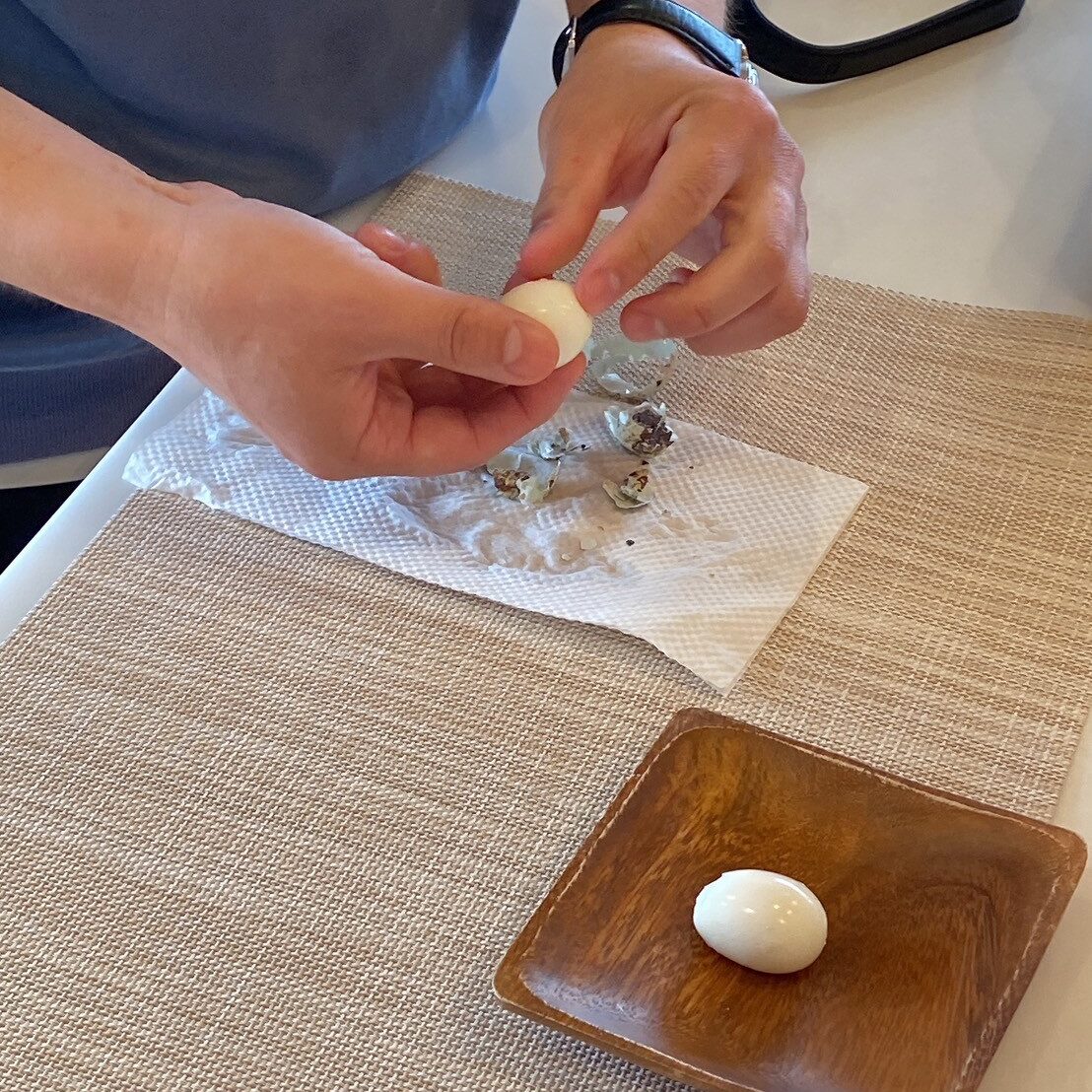 そこで新入staffと一緒に、うずらのたまごの殻剥き体験や目玉焼きの試食を行いました✨